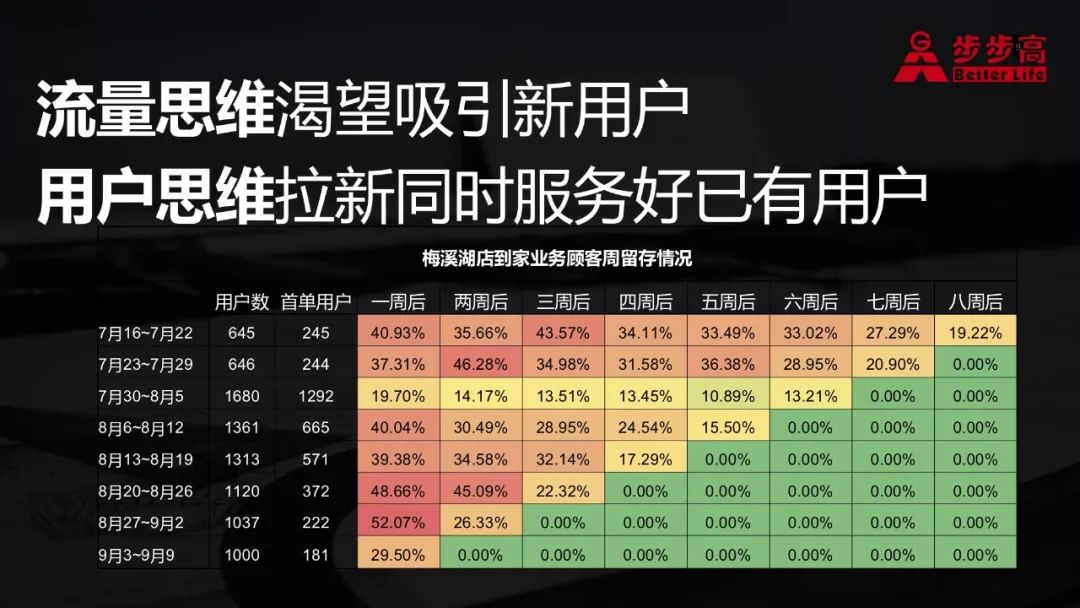 在唐育看來,微信群高性價比的流量渠道,具有較強的客戶粘合度。以步步高超市梅溪新天地2018年7月份的數據為例,首批645名社群用戶在八周以后依然有19.22%用戶頻繁下單,而這時他們已經被轉化為到家業務的成熟用戶。